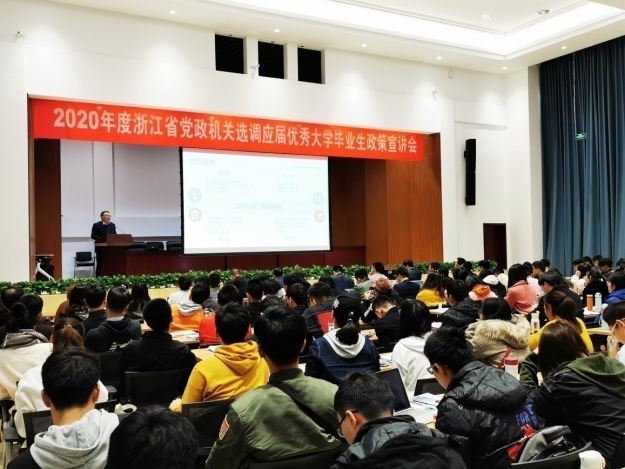 11月7日,2020年度浙江省黨政機(jī)關(guān)面向中國(guó)社會(huì)科學(xué)院大學(xué)選調(diào)生政策宣講會(huì)在我校望京校區(qū)報(bào)告廳召開(kāi)。浙江省委組織部副部長(zhǎng)、省公務(wù)員局局長(zhǎng)胡旭陽(yáng)出席會(huì)議并作動(dòng)員講話(huà),浙江省委組織部干部規(guī)劃辦主任熊?chē)?guó)和作政策解讀,浙江省委組織部規(guī)劃辦吳俊進(jìn)行了現(xiàn)場(chǎng)答疑。我校黨委副書(shū)記、副校長(zhǎng)王兵出席會(huì)議并講話(huà)。宣講會(huì)還設(shè)置了現(xiàn)場(chǎng)推介環(huán)節(jié),來(lái)自浙江省委辦公廳、浙江警官職業(yè)學(xué)院、杭州市、寧波市、溫州市、嘉興市、湖州市、紹興市、金華市、衢州市、舟山市、臺(tái)州市、麗水市組織部門(mén)的同志接受了同學(xué)們的現(xiàn)場(chǎng)咨詢(xún)和答疑。我校近200名同學(xué)參加了此次宣講會(huì)。
